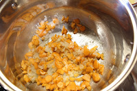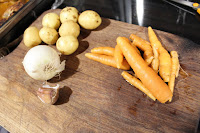 Poti põhja lisasin pisut õli ja praadisin sibula-küüslaugu pisut läbi, nii et segu oleks aromaatne kuid mitte kõrbenud, lisasin porgandi ja kuumutasin veelkorra läbi. Siis lisasin u 2 liitrit keevat vett ja jätsin madalale tulele podisema. Hakkisin suhteliselt suvaliselt ka kartuli ja panin potti.