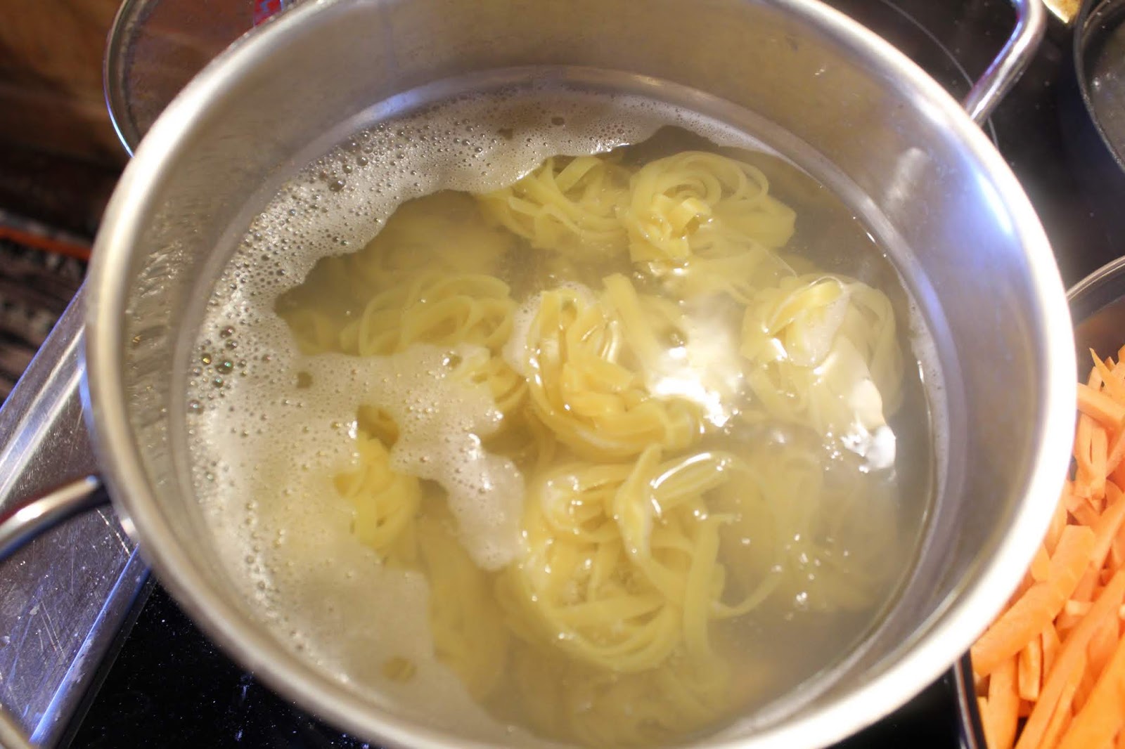 Selleks ajaks peaks vesi juba keema ja lisan oma munanuudlid, oluline on et nad saaksid valmis selleks ajaks kui mul on neid pannile panna vaja, pisut ajaplaneerimist tuleb teha.