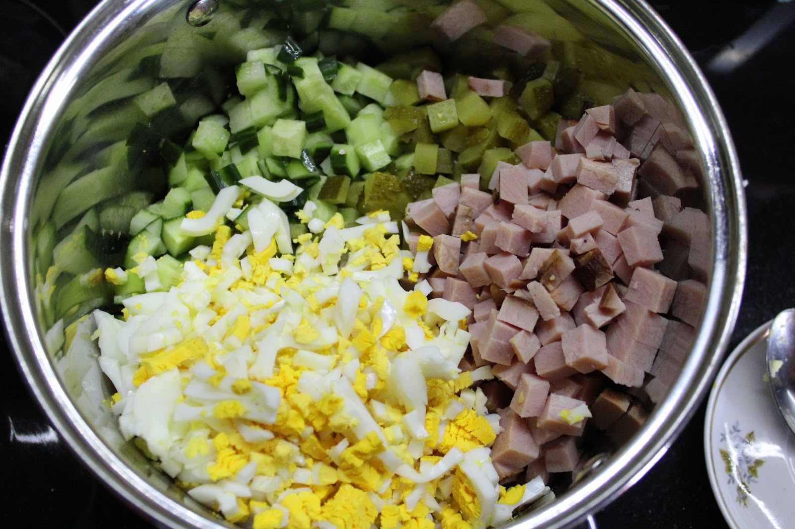 Siis jätkan salatiga, järgmisena lisan kurgi, siis hapukurgi. Käsitsi lõigun juurde ka singi, teda lõikuriga teha ei saa, kuna singikiud jäävad sinna vahele kinni ja ei tule ilusad kuubikud, vaid singipuder.